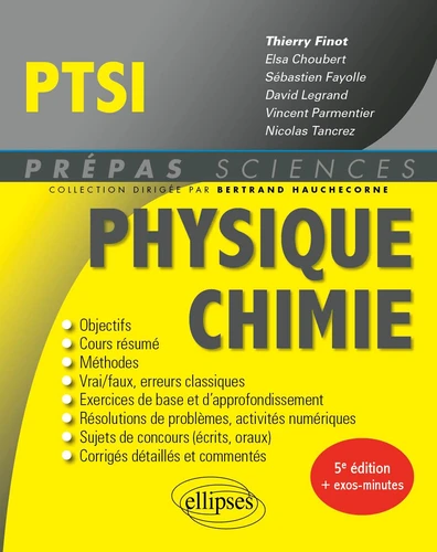 La 5e édition de cet ouvrage a pour objectifs de permettre aux étudiants en PTSI de réviser leur cours de Physique-chimie et de l'assimiler par la mise en application des notions. Dans chaque chapitre, correspondant à peu près à une semaine de cours, le lecteur trouvera notamment : - Le résumé de cours et les méthodes, pour assurer ses connaissances ; - Le vrai/faux pour tester sa compréhension du cours et éviter de tomber dans les erreurs classiques ; - Les exercices corrigés, souvent tirés de sujets d'annales, pour s'entraîner aux concours.
