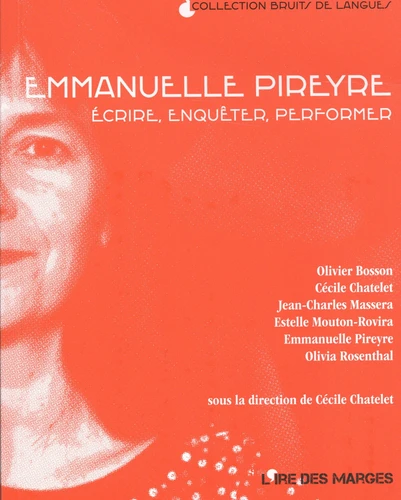 Un ouvrage collectif sur l'oeuvre d'Emmanuelle Pireyre composé à partir d'entretiens avec l'autrice et coordonné par Cécile Chatelet. Pour donner à voir et à lire l'oeuvre plurielle d'Emmanuelle Pireyre, Cécile Chatelet a réuni une équipe composée d'Olivia Rosenthal (écrivaine et professeure des universités), Estelle Mouton-Rovira (maîtresse de conférences spécialiste de littérature contemporaine), Olivier Bosson (artiste, auteurs de films et de performances) et Jean- Charles Massera (écrivain, réalisateur, auteur de plusieurs réalisations sonores et installations).