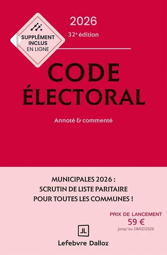 [Elections municipales de mars 2026] L'allié indispensable des candidats et des organisateurs Les + de l'édition 2026 : - A jour notamment de la loi du 21 mai 2025 visant à harmoniser le mode de scrutin aux élections municipales afin de garantir la vitalité démocratique, la cohésion municipale et la parité ; de la loi du 18 juillet 2025 sur le droit de vote par correspondance des personnes détenues ; de la loi du 11 août 2025 sur la réforme du mode d'élection des membres du conseil de Paris et des conseils municipaux de Lyon et de Marseille - l'outil de référence pour les candidats aux élections et les collectivités territoriales ; - commenté par un spécialiste de la matière ; - une analyse rigoureuse de la jurisprudence électorale ; - à jour des derniers textes et circulaires ; - inclus : supplément e ligne du code.