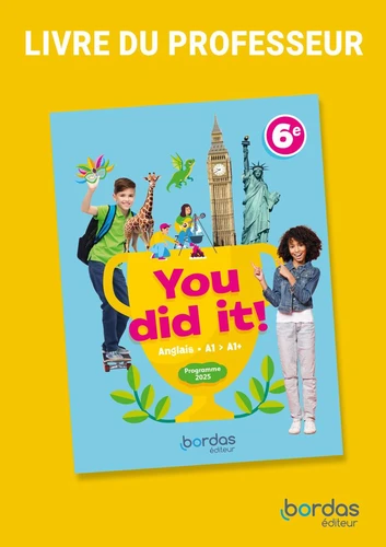 You did it ! , une méthode innovante et positive pour tous les élèves de 6e : inspirée par les derniers enseignements de la recherche ; adaptée aux besoins actuels des professeurs ; attractive , ludique, motivante et accessible ; qui valorise les réussites ; en phase avec les centres d'intérêt des élèves tout en éveillant leur curiosité ; une grammaire créative et joyeuse qui facilite la mémorisation des structures ; 7 clips de chansons chorégraphiées très dynamiques, avec karaoké ; 7 escape games ; 7 tutos peers-to-peers pour les activités créatives Youd did it ! est également une méthode prête à l'emploi qui assure l'autonomie de l'élève et facilite le travail du professeur.