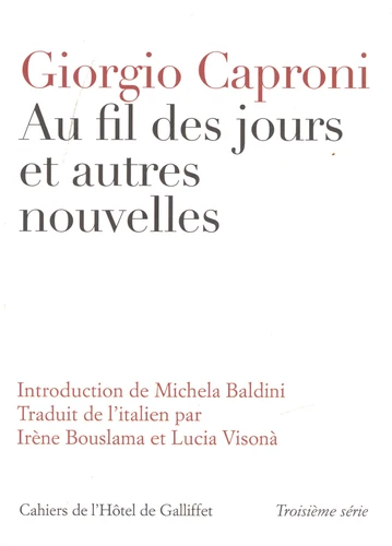 Dans un entretien de 1984, le poète Giorgio Caproni manifestait son intérêt pour la prose à laquelle il s'était consacré surtout entre la fin des années 1930 et celle des années 1940 : "J'ai toujours gardé la nostalgie des nouvelles - admettait-il - et je crois avoir été l'un des premiers poètes à avoir donné une dimension narrative à ses vers". Les dix-sept nouvelles de ce recueil ont pour la plupart été publiées dans des journaux et des revues et seule "Au fil des jours" , qui donne son titre à ce volume, est parue du vivant de l'auteur chez Rizzoli.