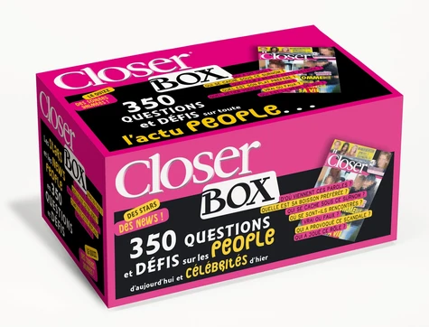 Dans la boîte : 350 cartes questions/réponses réparties en 6 thématiques (Musique, Cinéma, Télévision,Séries, Personnalités, Sport). 1 livret de 32 pages avec la règle du jeu et des commentaires sur les réponses. Les questions sont des QCM, des vrais ou faux, des questions ouvertes, etc.). Quelques exemples : Quel métier exerçait Harrison Ford avant de devenir acteur? (a) policier, b) cuisiner c) charpentier ? réponse c).