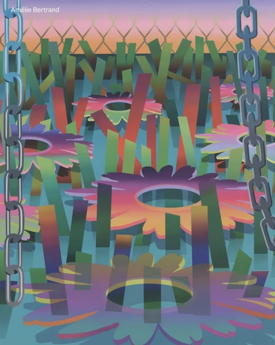Au moyen d'une peinture d'une facture impeccablement lisse, Amélie Bertrand s'éloigne des paysages idéaux inspirés de la nature et forme des décors entre rêves et cauchemars. Ses plans et surfaces sont échafaudés avec complexité et minutie, pour bifurquer dans des perspectives biaisées et des horizons sans profondeur. Toutes sortes de matériaux et motifs typiques de l'époque saturent la composition : OSB, stratifié, grillage, carrelage, molleton, chaîne, feuillage, camouflage.