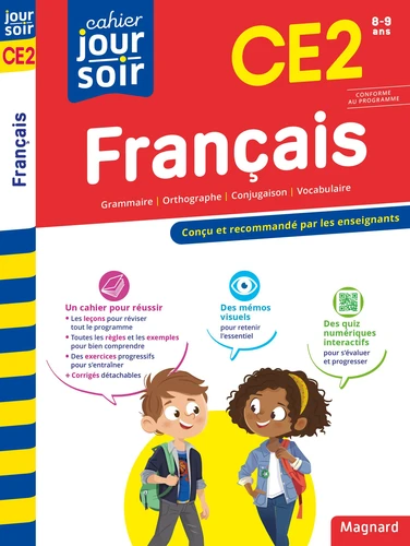 Pour revoir tout le programme et progresser en français - Réviser et s'entraîner - Tout le programme de CE2 : grammaire, orthographe, conjugaison, vocabulaire - Des leçons synthétiques avec toutes les règles et des exemples - Des exercices variés pour vérifier l'acquisition des connaissances et les mettre en pratique - Un cahier central détachable avec tous les corrigés - Mémoriser l'essentiel grâce aux mémos visuels De nombreux schémas et cartes mentales : le groupe nominal, le verbe et son sujet, les homonymes, le masculin et le féminin, le singulier et le pluriel, les tableaux de conjugaison (présent, imparfait, futur, passé composé)...