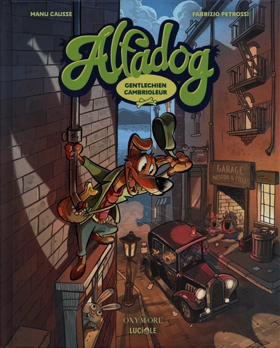 SIGNE MANU CAUSSE ET FABRIZIO PETROSSI, "ALFADOG" CONTE LES AVENTURES HALETANTES D'UN GENTLECHIEN CAMBRIOLEUR AU GRAND COUR. Alfadog, gentlechien cambrioleur et ennemi public numéro 1 du temps de sa splendeur, vient de s'échapper d'une prison de haute sécurité. C'est la panique à Dogoville et, comme à l'époque, l'inspecteur Mc Crockett est sur l'affaire, ne lui laissant aucun répit. Victime d'une odieuse machination, Alfadog se retrouvera malgré lui au coeur d'un cambriolage... le vol d'une oeuvre d'art inestimable au musée de Dogoville ! Parviendra-t-il à échapper à la police ? ... Un polar "pour rire" bourré de clins d'oeil aux classiques du film noir.