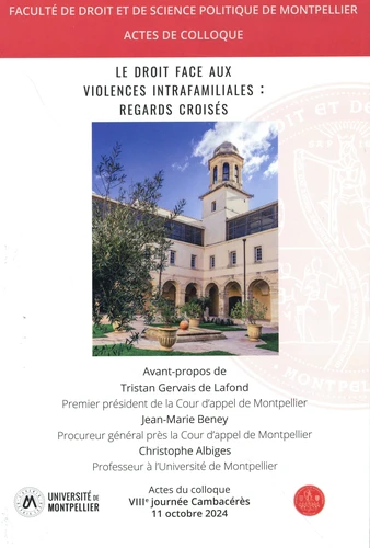 Le présent ouvrage est composé des interventions présentées lors de la Ville journée Cambacérès, colloque organisé le 11 octobre 2024 à la Faculté de Droit et Science politique de Montpellier dans le cadre du partenariat avec la Cour d'appel de Montpellier. Le thème retenu à l'occasion de cette VIIIe journée est celui du droit face aux violences intrafamiliales, regards croisés de praticiens et d'universitaires, qu'ils soient pénalistes comme civilistes.