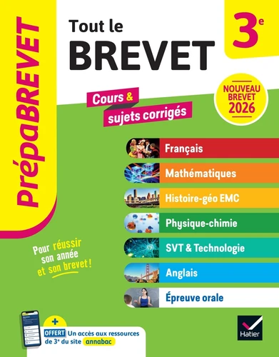 En un seul ouvrage, toutes les matières au programme de la 3e et un entraînement pour les cinq épreuves du nouveau brevet 2026. Un outil de travail très complet pour réussir son année et passer en 2de en toute sérénité ! Toutes les matières de 3e et toutes les épreuves du brevet - Toutes les matières évaluées au brevet en contrôle continu et lors de l'examen final : Français, Maths, Histoire-Géographie EMC, Physique-Chimie, SVT, Technologie, Anglais.