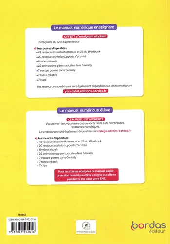 Un manuel innovant pour un apprentissage ludique Une présentation des grands principes qui ont guidé le travail de nos auteurs. Un tableau de présentation des objectifs de chaque unité (culturel, lexical, grammatical, phonologique, activités langagières, stratégies pour permettre aux élèves de progresser, rebrassage et différenciation). Un autre tableau présentant, pour chaque unité, les objectifs de développement durable , les compétences du XXIe siècle et une proposition de projet eTwinning pour les professeurs qui enseignent dans un établissement habilité ERASMUS+ ou qui souhaitent mettre en place un échange virtuel avec un établissement étranger ; Une bibliographie en 4 parties, en fonction des concepts fondamentaux qui ont constitué notre fil conducteur : un élève heureux est un élève qui apprend mieux, les stratégies efficaces pour développer les savoirs et les activités langagières, la différenciation et l'évaluation.