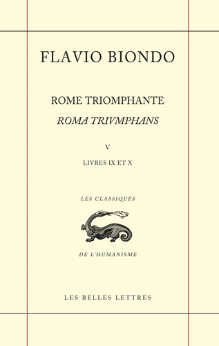 Il est d'ailleurs frappant que ce livre prépare la description de la pompa qui accompagne le triomphe des empereurs et les processions pontificales. Le livre X consacré aux triomphes de Rome constitue à lui seul la cinquième et dernière partie. Le choix de réunir dans ce volume final les livres IX et X de Rome triomphante, le premier dédié à la vie privée des Romains, le second culminant dans la présentation "aux regards , et aux esprits" d'une vision de "la Ville de Rome florissante et triomphante telle que souhaitait la voir saint Augustin" permet de saisir les lignes de force qui confèrent à l'immensum opus de Biondo la dynamique d'un ensemble qui intègre une somme sur les institutions et les antiquités romaines dans la perspective ontologique d'un triomphe idéal et virtuel.