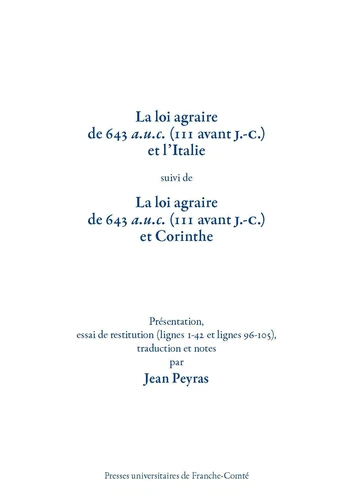 La partie italienne de la loi agraire de 111 avant J. -C. (lignes 1-42) mit fin aux bouleversements des réformes révolutionnaires des Gracques. L'auteur, qui avait précédemment étudié les lignes 43-95 consacrées à l'Afrique (PUFC 2015) d'un texte qu'il identifie comme une lex Baebia, soutient que le vectigal fut maintenu en Italie, que la privatisation n'est pas une propriété exclusive du bénéficiaire sur les terres conquises qui constituèrent l'ager publicus Populi Romani, que cette privatisation fut une possession soumise à certaines obligations de mise en valeur et que la propriété éminente de la Res Publica se maintint à travers les temps.
