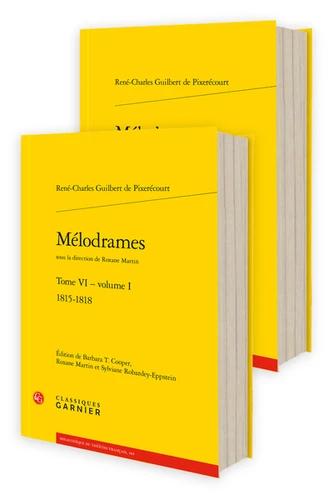 Les années 1815-1818 constituent une période difficile pour Pixerécourt, désormais malmené par une partie de la critique. En dépit d'une cabale persistante, il parvient toutefois à renouer avec le succès en développant des dispositifs dramatiques différents d'une pièce à l'autre. Il expérimente le mélodrame polyglotte avec Christophe Colomb, intègre le procédé du diorama dans Le Belvédère ou la Vallée de l'Etna, propose un mélodrame sans victime ni traître dans Le Suicide ou le Vieux Sergent, invente la formule du mélodrame judiciaire dans Le Monastère abandonné qu'il parachève avec La Chapelle des bois. Les cinq mélodrames de ce tome permettent d'apprécier l'inventivité d'un auteur pourtant jugé comme suranné par quelques contemporains.
