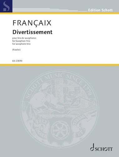 Matthew Fowlers Arrangement von Françaix' Divertissement hebt die technische Brillanz sowie die harmonische Komplexität des französischen Komponisten hervor und präsentiert das originale Werk für Holzbläser als virtuoses Stück für Saxophon-Trio. Instrumentation : saxophone trio