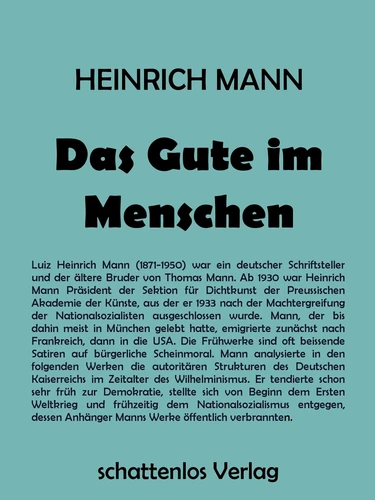 Luiz Heinrich Mann (1871-1950) war ein deutscher Schriftsteller und der ältere Bruder von Thomas Mann. Ab 1930 war Heinrich Mann Präsident der Sektion für Dichtkunst der Preussischen Akademie der Künste, aus der er 1933 nach der Machtergreifung der Nationalsozialisten ausgeschlossen wurde. Mann, der bis dahin meist in München gelebt hatte, emigrierte zunächst nach Frankreich, dann in die USA. Die Frühwerke sind oft beissende Satiren auf bürgerliche Scheinmoral.