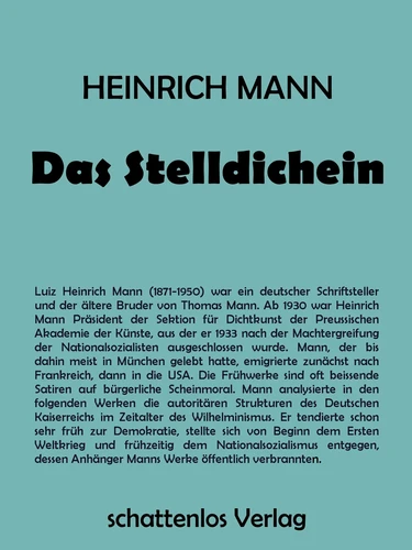Luiz Heinrich Mann (1871-1950) war ein deutscher Schriftsteller und der ältere Bruder von Thomas Mann. Ab 1930 war Heinrich Mann Präsident der Sektion für Dichtkunst der Preussischen Akademie der Künste, aus der er 1933 nach der Machtergreifung der Nationalsozialisten ausgeschlossen wurde. Mann, der bis dahin meist in München gelebt hatte, emigrierte zunächst nach Frankreich, dann in die USA. Die Frühwerke sind oft beissende Satiren auf bürgerliche Scheinmoral.