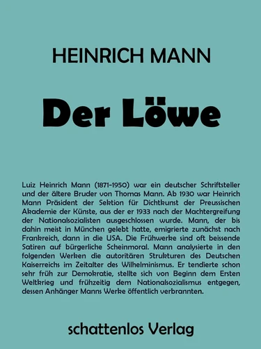 Luiz Heinrich Mann (1871-1950) war ein deutscher Schriftsteller und der ältere Bruder von Thomas Mann. Ab 1930 war Heinrich Mann Präsident der Sektion für Dichtkunst der Preussischen Akademie der Künste, aus der er 1933 nach der Machtergreifung der Nationalsozialisten ausgeschlossen wurde. Mann, der bis dahin meist in München gelebt hatte, emigrierte zunächst nach Frankreich, dann in die USA. Die Frühwerke sind oft beissende Satiren auf bürgerliche Scheinmoral.