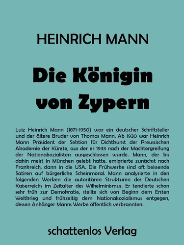 Luiz Heinrich Mann (1871-1950) war ein deutscher Schriftsteller und der ältere Bruder von Thomas Mann. Ab 1930 war Heinrich Mann Präsident der Sektion für Dichtkunst der Preussischen Akademie der Künste, aus der er 1933 nach der Machtergreifung der Nationalsozialisten ausgeschlossen wurde. Mann, der bis dahin meist in München gelebt hatte, emigrierte zunächst nach Frankreich, dann in die USA. Die Frühwerke sind oft beissende Satiren auf bürgerliche Scheinmoral.
