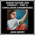 Section II: Morals are Human Humane morals; natural law and morals; place of science. Section III: What is Freedom? Elements in freedom; capacity in action; novel possibilities; force of desire. Section IV: Morality is Social Conscience and responsibility; social pressure and opportunity; exaggeration of blame; importance of social psychology; category of right; the community of religious symbol. Soloist supplementary note: Very important but sometimes overlooked is his concept in Part 3 of the book of "Dramatic Rehearsal" which to me means: when we are deliberating over a course of action, we don't just tote up an arithmetic series of "if I do THIS, then THIS will happen, and then THIS will happen, etc.