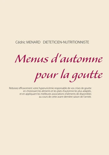 L'auteur vous propose trois mois de menus spécifiquement adaptés à votre goutte, tous très simples à mettre en pratique grâce à des plats, des légumes et des fruits d'automne qui vous sont proposés, vous permettant ainsi de mieux adapter votre alimentation à votre pathologie.