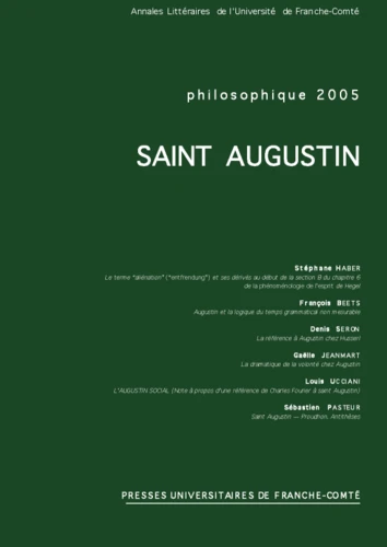 Sommaire : Stéphane Haber, Le terme « aliénation » (« entfremdung ») et ses dérivés au début de la section B du chapitre 6 de la Phénoménologie de l'esprit de Hegel / François Beets, Augustin et la logique du temps grammatical non mesurable / Denis Seron, La référence à Augustin chez Husserl / Gaëlle Jeanmart, La dramatique de la volonté chez Augustin / Louis Ucciani, L'Augustin social / Sébastien Pasteur, Saint-Augustin - Proudhon