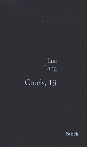 En une poignée de fables féroces, Luc Lang saisit et conjugue la brutalité de notre monde contemporain sur tous les tons : c'est drôle, triste, tragique, dérisoire ou douloureux, c'est toujours impitoyable... Le couple, la famille, mais aussi l'entreprise, le voisinage, la ville ou la route sont autant de lieux qui servent de décor à ces contes cinglants. On sera tour à tour le salaud qui sème la méchanceté comme les abeilles le pollen, la victime qui subit la sauvagerie des autres, ou encore la proie d'une situation piégée dans laquelle on tombe sans le vouloir. Cruels, 13 est une fresque du présent, donc, éparpillée en un puzzle de cruautés auxquelles personne, finalement, n'échappe. On rit, on pleure, on grince des dents.