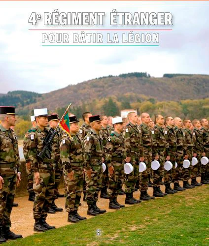 Né en 1920 à Marrakech, ville toujours présente sur l'insigne du régiment. le 4e régiment étranger a notamment participé à la pacification du Maroc, lui valant ainsi le surnom de "régiment marocain", et aux combats en Afrique du Nord lors de la Seconde Guerre mondiale. Dissous et reformé à de multiples reprises suite aux bouleversements de la seconde moitié du siècle dernier, le 4e RE est depuis 1976 installé à Castelnaudary, où il a l'importante responsabilité de former les légionnaires, et entre autres de leur apprendre le français.