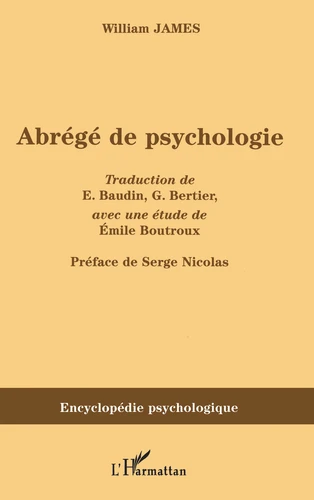 Nous proposons ici une traduction intégrale, la seule actuellement disponible, de son Abrégé de psychologie (1892) réalisée par E. Baudin et G. Bertier. Nous faisons précéder cette réédition de cette traduction par un texte important sur la psychologie de James publié par le philosophe E. Boutroux. Ce livre s'adresse aux psychologues, philosophes, savants et étudiants désireux de lire un des écrits les plus fondamentaux de James.