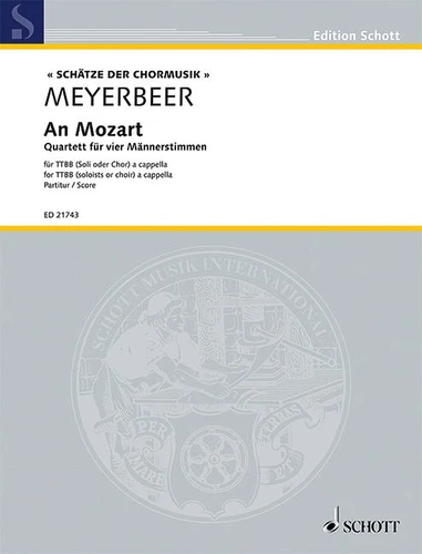 Apart from many other treasures by Giacomo Meyerbeer, the Choral Treasury series also contains his compositional gem An Mozart. The quartet for four male a cappella voices (TTBB) is based on a text by Ludwig Rellstab. Even in this brief musical bow to Mozart, Meyerbeer's affinity for the opera cannot be denied : He uses a wide harmonic, technical and dynamic range of expression and makes impressive use of the full ambitus of the male choir.