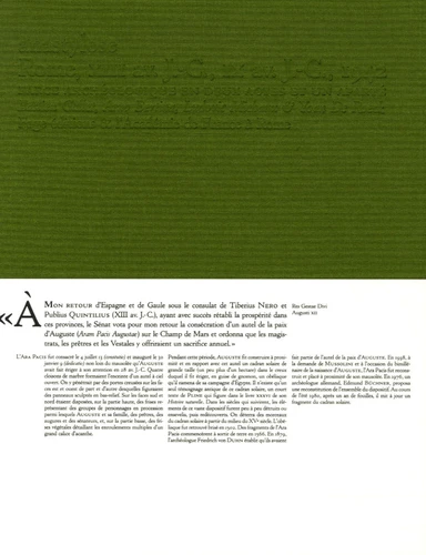 On a voulu construire un lieu. On, c'est-à-dire Auguste, qui alla jusqu'à mettre son corps (cadavre) dans l'affaire. Un lieu qui aura été un symbole (un objet coupé en deux dit l'étymologie du mot grec, et dont le rassemblement seul fera signe). Le symbole ajointait la course du Soleil dans le ciel romain et la paix de l'Empire (indexée au corps mort d'Auguste gisant dans son mausolée et au trône vide de l'Ara Pacis que l'ombre pointait à midi le jour de l'équinoxe d'automne), cet ajointement démesuré, le lieu en question, était un cadran solaire dont le tracé en hyperbole couvrait une partie du Champs de Mars et dont le style était un obélisque de granit rose de vingt-deux mètres de hauteur.