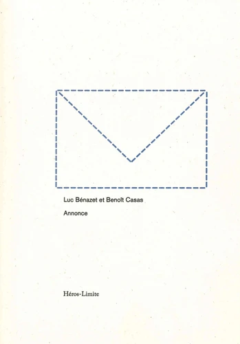 Annonce d’une mort prochaine. Annonce de futurs, possibilités de vie, en commun. Annonce, que Luc Bénazet et Benoît Casas écrivent ensemble, est leur deuxième livre. Après Envoi. Chacun adresse ses blocs de prose le même jour. Chaque semaine, une double page s’écrit où la place des blocs est réglée : une lecture peut commencer. Et se répète, six mois durant.