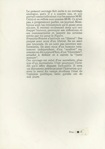 Le présent ouvrage fait suite à un ouvrage analogue, paru il y a quatre ans, et qui portait essentiellement sur les années 56-62. Celui-ci se réfère aux années 62-65. Ce n'est pas, à proprement parler, un journal. Nombreux sont les événements qu'il passe sous silence. Il retient seulement ceux qui ont frappé l'auteur, provoqué ses réflexions et ses commentaires et inspiré les articles écrits par lui pour le Figaro. François-Poncet s'intitule un "libéral". Ses propos sont ceux d'un libéral. Ils ne sont pas toujours, ils ne sont pas souvent conformistes. Ils ne sont ceux d'un homme totalement indépendant, d'un "modéré" ou, comme on dit aujourd'hui, d'un "Centriste", attaché à définir et à suivre la "juste mesure". Cet ouvrage est celui d'un moraliste, plus que d'un journaliste. C'est pourquoi l'intérêt qu'il offre dépasse l'actualité. Il sera un document précieux pour l'historien qui avec le recul du temps étudiera l'état de l'opinion publique, telle qu'elle est de nos jours.