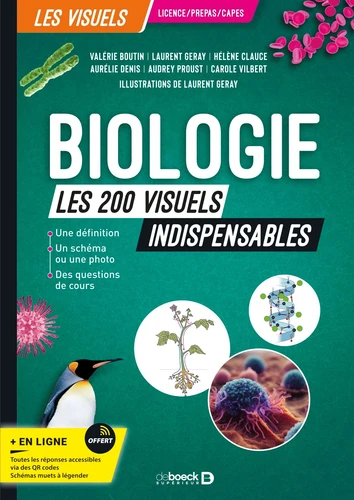 En 200 fiches illustrées, l'essentiel de la biologie en un coup d'oeil ! Ce livre, constitué de 200 fiches illustrées, traite les principales notions de biologie attendues dans l'enseignement supérieur (licence SVT, CAPES, Agrégation SV-STU et prépas BCPST). Chaque fiche propose : - un court texte introductif présentant la définition des mots importants et décrit les grandes idées liées au thème traité. - un grand schéma ou une grande photo pour une approche visuelle concrète - une série de petites questions permettant au lecteur de tester ses connaissances. Chaque réponse est accessible via des QR codes.