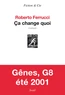 Le G8 de Gênes, en juillet 2001. Une grande manifestation altermondialiste se déroule au moment même. La manifestation dégénère : d’abord des bagarres, des pillages, puis pendant les heurts avec la police, un jeune manifestant est tué d’un coup de pistolet par un carabinier. Le lendemain, sans justification, la police fait irruption dans l’école Diaz, où est installé le « media center » des altermondialistes, avec leur rédaction, leur radio, leur centre d’information. Quatre-vingt-dix-sept personnes de toutes nationalités sont matraquées, certaines finissent à l’hôpital, d’autres sont embarquées, torturées puis libérées au bout de plusieurs jours. Le narrateur de Ça change quoi, un journaliste, était à Gênes pendant ces journées ; il a suivi le cortège des manifestations, assisté aux bagarres. Il rapporte ses rencontres – Elisa – ses réminiscences, dans l'image d'Angela, la femme qu'il vient de quitter. Au début du livre, des années après le G8, le narrateur prend le train pour revenir à Gênes. Pour se remémorer les événements, les émotions de l’époque, pour comprendre ce que le temps a déposé en lui, il s’enferme dans la chambre d'un hôtel et se « repasse le film » du G8, grâce tout ce que peut offrir la technologie de l’information du XXIe siècle; Ça change quoi est aussi le roman d’un événement – le G8 de Gênes – où les nouvelles formes de communication de masse se sont affirmées pour la première fois. Ça change quoi est une image de notre temps, avec ses mouvements de masse, sa violence politique, ses innombrables clivages, sa technologie de l’information, et les passions impuissantes des individus.