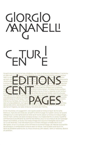 Toute l'oeuvre de Manganelli tourne autour d'un questionnement ou d'un détournement de l'écriture ; chacun de ses livres est un de ces météores noirs. Il s'avance dans la critique, dans le fait divers, relit Pinocchio ou Poe. Mais, avec Centurie, c'est à la maladie du roman qu'il s'attaque. A quoi bon ce ronron des histoires, si votre intrigue, son enjeu, sa manière et son dénouement, on peut tout faire tenir en une page ? Alors ce serait une sorte de rictus.