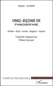 Les " Cinq leçons de philosophie " de Xavier Zubiri sont en Espagne un classique de la philosophie contemporaine. L'auteur y interroge Aristote, Kant, Auguste Comte, Bergson et Husserl sur ce que représente pour eux la philosophie comme science. Dans ces leçons, Zubiri fait preuve d'un talent didactique exceptionnel et d'un intérêt particulier pour la philosophie française. Le traducteur a jugé utile d'ajouter à ces cinq leçons une sixième, où il renvoie à Zubiri sa propre question Qu'est-ce qu'à votre sens la science philosophique ? Ce livre est accessible à un large public, qui appréciera la clarté de l'exposé en même temps que sa pénétration au cœur même du génie philosophique.