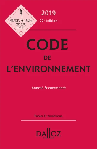 Les + de l'édition 2019 : une jurisprudence constamment mise à jour, intégrant les premiers arrêts relatifs au principe de non-régression et à l'autorisation environnementale, - l'intégralité des listes d'espèces protégées sur le territoire, - un code annoté et commenté mis à jour en continu sur smartphone, tablette et internet. La 22e édition du Code de l'environnement Dalloz est à jour de la loi du 2 mars 2018 de ratification des ordonnances relatives à l'évaluation environnementale des projets, plans et programmes et à la participation du public à certaines décisions susceptibles d'avoir une incidence sur l'environnement, du décret du 4 juin 2018 sur les rayonnements ionisants, du décret du 28 juin 2018 relatif à la chasse, de la loi du 30 juillet 2018 sur la protection du secret des affaires et de celle du 3 août visant à garantir la présence des parlementaires dans certains organismes, du décret du 18 septembre 2018 relatif au dossier de demande d'autorisation environnementale, du décret du 4 octobre relatif aux schémas directeurs d'aménagement et de gestion des eaux et schémas d'aménagement et de gestion des eaux, du décret du 22 octobre 2018 modifiant la procédure de sortie du statut de déchet, de la loi ELAN du 23 novembre 2018, du décret du 28 novembre 2018 créant un label Bas-Carbone ...