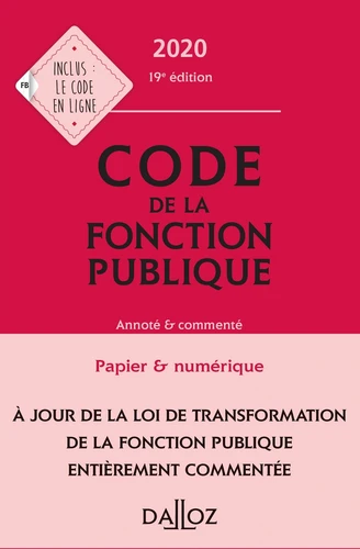 Le code est à jour notamment des textes suivants : la très attendue loi de transformation de la fonction publique dite "TFP" du 6 août 2019 entièrement commentée ; le décret du 19 décembre 2019 mettant en oeuvre l'élargissement des possibilités de recrutement des contractuels, un des axes majeurs de loi TFP ; les décrets du 31 décembre 2019, relatifs à la rupture conventionnelle, aux indemnités liés à cette rupture conventionnelle et aux emplois de direction dans la fonction publique d'Etat ; le décret du 22 janvier 2020 modifiant la liste des emplois concernés par la remise préalable d'une déclaration d'intérêts ainsi que les modalités de transmission de cette déclaration d'intérêts.