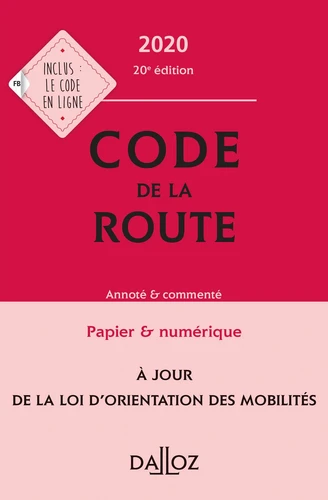 L'édition 2020 du Code de la route est notamment à jour des textes suivants : - loi d'orientation des mobilités ; - décret sur la lutte contre la conduite après usage de substances ou plantes classées comme stupéfiants ; - décret sur l'information du public sur les prix du contrôle technique de véhicules légers ; - décret sur la règlementation des engins de déplacement personnel ; - ordonnance sur la partie législative du code de la justice pénale des mineurs ; - décret sur le droit de conduire limité aux seuls véhicules équipés d'un éthylotest anti-démarrage ; - décret sur les engins de service hivernal.