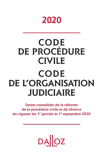 A jour des décrets d'organisation judiciaire d'août et septembre 2019 et des décrets de procédure civile et de divorce de décembre 2019. Le présent ouvrage comprend les textes du code de procédure civile et du code de l'organisation judiciaire. L'ensemble est à jour des lois et décrets publiés au 1er janvier 2020 et notamment : - De la loi du 23 mars 2019 de programmation 2018-2022 et de réforme pour la justice ; - Du décret du 22 juillet 2019 de coordination de la loi du 23 mars 2019 de réforme pour la justice en matière de protection juridique des majeurs, de changement de régime matrimonial, d'actes non contentieux confiés aux notaires et de prorogation de l'attribution provisoire de la jouissance du logement de la famille et mesure relative à la reconnaissance transfrontalière des décisions de protection juridique des majeurs ; - Des décrets et arrêté du 30 août 2019 notamment relatif au nouveau tribunal judiciaire ; - Du décret de décembre 2019 réformant la procédure civile ; - Du décret de décembre 2019 relatif à la procédure applicable aux divorces contentieux et à la séparation de corps ou au divorce par consentement mutuel réalisés selon les modalités de l'article 229-1 du code civil.