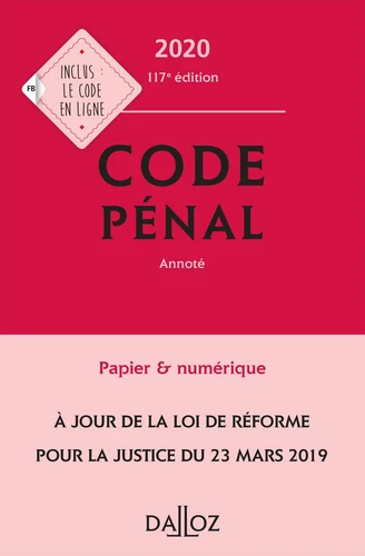 Le Code pénal Dalloz 2020 est notamment à jour : de la loi du 10 avril 2019 de maintien de l'ordre lors des manifestations ; de la loi du 23 mars 2019 de programmation 2018-2022 et de réforme pour la justice ; de la loi du 22 décembre 2018 de lutte contre la manipulation de l'information ; de l'ordonnance du 12 décembre 2018 sur la protection des données personnelles ; de la loi du 23 octobre 2018 de lutte contre la fraude.