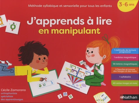 Un coffret proposant une méthode syllabique et sensorielle complète et originale. L'enfant découvre les lettres et le son qu'elles produisent, manipule les syllabes puis forme des mots. Grâce à cette méthode qui sollicite ses capacités visuelles, auditives et corporelles, l'enfant apprend à lire facilement. La méthode est progressive et va des sons les plus simples aux sons les plus complexes. Un coffret complet qui comprend : Un livre méthode de lecture de 96 pages pour apprendre de façon progressive à lire les sons, les syllabes et les mots Une ardoise magnétique et 56 lettres-personnages magnétiques pour réaliser les activités de lecture indiquées dans la méthode Un syllabaire ludique pour composer les syllabes à l'aide des lettres-personnages Un jeu de "Cherche et trouve" : l'enfant retrouve les sons appris en les identifiant à des images ou à des mots 40 cartes images et mots pour prolonger son apprentissage de la lecture de façon ludique composé d'une méthode de lecture, d'une ardoise magnétique, de lettres-personnages magnétiques, de 2 planches et de 40 cartes images et mots.