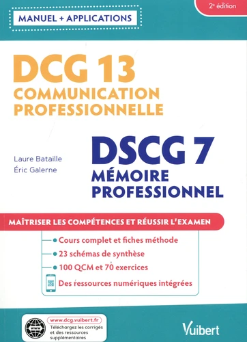 Livre de préparation à l'épreuve, avec applications Tout pour comprendre les attentes du programme du DCG13 Communication professionnelle et du DSCG7 Mémoire professionnel Maîtriser tous les savoirs et les compétences Un cours de méthodologie complet et visuel 50 définitions de notions clés 90 exemples concrets 23 schémas de synthèse pour réviser efficacement Préparer efficacement et obtenir le DCG13 Communication professionnelle et le DSCG7 Mémoire professionnel : 100 QCM et 70 exercices de difficulté progressive Des ressources à flasher pour réviser : QCM interactifs, flashcards Offert : retrouvez sur le site dédié à la collection de manuels DCG Vuibert : les corrigés des applications des schémas de synthèse pour réviser efficacement des conseils pour bien préparer l'examen des conseils pour apprendre à utiliser le mind mapping