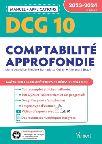 Tout le programme du DCG 10 Comptabilité approfondie Maîtrisez tous les savoirs et les compétences : Un cours complet et visuel 130 définitions de notions clés Des fiches méthode pour comprendre les attentes de l'examen Des mises en situation 130 exemples concrets 20 schémas de synthèse pour réviser efficacement Vidéo de professionnels de l'expertise, en partenariat avec le Lab50 Entraînez-vous de manière intensive au DCG 10 Comptabilité approfondie : 300 QCM et 100 exercices de difficulté progressive Des cas pratiques guidés et corrigés Des grilles pour s'autoévaluer Des ressources à flasher pour réviser : QCM interactifs, flashcards 5 sujets type d'examen pour être prêt le jour J OFFERTS : retrouvez sur le site dédié à la collection de manuels DCG Vuibert : les corrigés des QCM et des exercices des schémas de synthèse pour réviser efficacement des conseils pour bien préparer l'examen des conseils pour apprendre à utiliser le mind mapping + 1 sujet type d'examen corrigé !