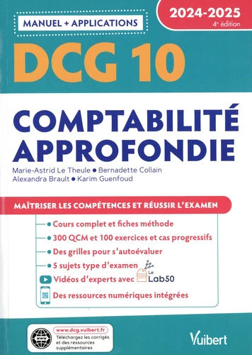 Entraînez-vous de manière intensive au DCG 10 Comptabilité approfondie : 300 QCM et 100 exercices de difficulté progressive ; Des cas pratiques guidés et corrigés ; Des grilles pour s'autoévaluer ; A flasher : QCM interactifs et flashcards pour réviser. 5 sujets type d'examen pour être prêt le jour J. OFFERTS : retrouvez sur le site dédié à la collection de manuels DCG Vuibert : les corrigés des QCM et des exercices ; des schémas de synthèse pour réviser efficacement ; des conseils pour bien préparer l'examen ; des conseils pour apprendre à utiliser le mind mapping ; toute l'actualité de l'expertise-comptable ; + 1 sujet type d'examen corrigé !