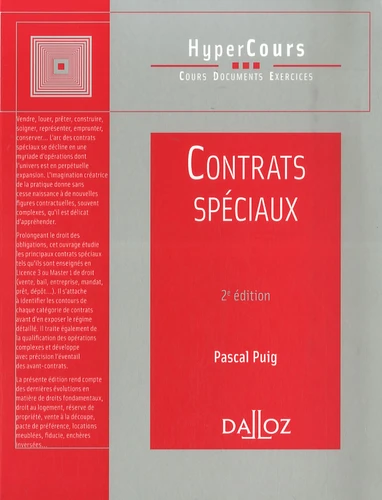 Vendre, louer, prêter, construire, soigner, représenter, emprunter, conserver... L'arc des contrats spéciaux se décline en une myriade d'opérations dont l'univers est en perpétuelle expansion. L'imagination créatrice de la pratique donne sans cesse naissance à de nouvelles figures contractuelles, souvent complexes, qu'il est délicat d'appréhender. Prolongeant le droit des obligations, cet ouvrage étudie les principaux contrats spéciaux tels qu'ils sont enseignés en Licence 3 ou Master 1 de droit (vente, bail, entreprise, mandat, prêt, dépôt...). Il s'attache à identifier les contours de chaque catégorie de contrats avant d'en exposer le régime détaillé. Il traite également de la qualification des opérations complexes et développe avec précision l'éventail des avant-contrats. La présente édition rend compte des dernières évolutions en matière de droits fondamentaux, droit au logement, réserve de propriété, vente à la découpe, pacte de préférence, locations meublées, fiducie, enchères inversées...