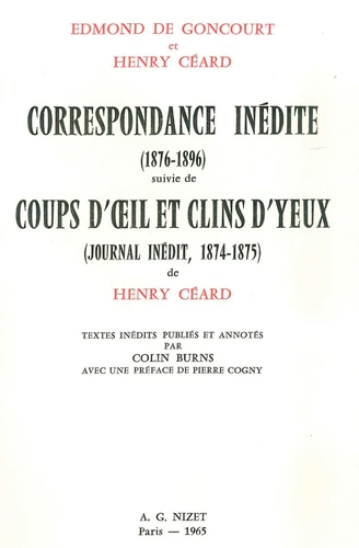 Correspondance inédite (1876-1896) suivie de Coups d'œil et Clins d'yeux (Journal inédit, 1874-1875) de Henry Céard. Textes inédits publiés et annotés par Colin Burns, avec une préface de Pierre Cogny