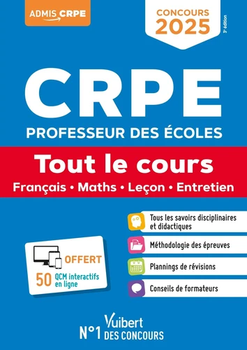 L'ouvrage indispensable pour exceller à toutes les épreuves du CRPE 2025 (M2) ! Mettez toutes les chances de votre côté en préparant les épreuves écrites de français et maths ainsi que les épreuves orales de leçon et entretien du concours de professeur des écoles, grâce à notre tout-en-un et : sa présentation des épreuves ; ses plannings de révisions ; sa méthode pas à pas, assortie de conseils de formateurs ; son cours complet traitant des connaissances à maîtriser : notions disciplinaires et didactiques. En complément de l'ouvrage, nous vous offrons 50 QCM interactifs de français et de maths ainsi que tous les conseils à suivre et pièges à éviter.