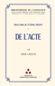 En 1937, Louis Lavelle, philosophe et professeur au Collège de France, fait paraître l'un de ses plus beaux ouvrages, De L'acte. Ce riche essai philosophique, resté de nombreuses années dans l'ombre, renaît ainsi. Louis Lavelle nous y invite, tout au long d'une réflexion aussi méthodique qu'inspirante à interroger, avec précision et finesse, le sens de notre participation au monde, la nature de notre immersion dans l'existence, une participation qui se réalise précisément dans l'Acte, notre Acte de participation : " La première expérience n'est pas celle du monde, ce n'est pas celle du corps.