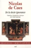 Cette nouvelle traduction de la "Docte ignorance" de Nicolas de Cues (1401-1464) a cherché à respecter le caractère progressif de l'ouvrage, en distinguant les trois livres comme autant de moments d'une initiation spirituelle. Il faut se garder, en effet, d'en rester aux analogies mathématiques du premier livre il faut monter jusqu'aux similitudes inscrites dans le grand Livre de la nature. Quant au troisième livre, il achève cette ascension mystique par une analyse des rapports entre le fidèle et le Christ.