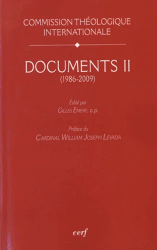 Composée de trente théologiens provenant de différents horizons culturels et théologiques, la Commission théologique internationale, créée en 1969 par le pape Paul VI, est un organisme proprement théologique, et non pas magistériel, rattaché à la Congrégation pour la Doctrine de la Foi. Examinant des thèmes d'actualité, elle offre une perspective théologique commune. Dans ce deuxième volume , elle réunit des documents élaborés et approuvés entre 1986 et 2009, traitant divers sujets de théologie fondamentale, dogmatique et morale : Foi et inculturation (1988) ; L'interprétation des dogmes (1989) ; Quelques questions actuelles concernant l'eschatologie (1992) ; Le Dieu Rédempteur : questions choisies (1995) ; Le christianisme et les religions (1996) ; Mémoire et réconciliation : l'Eglise et les fautes du passé (2000) ; Le diaconat : évolution et perspectives (2003) ; Communion et service : la personne humaine créée à l'image de Dieu (2004) - celui-ci inédit jusqu'à présent en version française ; L'espérance du salut pour les enfants qui meurent sans baptême (2007) ; A la recherche d'une éthique universelle : nouveau regard sur la loi naturelle (2009).