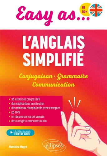 Allant à l'essentiel, Easy as... comprend 12 chapitres proposant : - un point sur les erreurs communes et donnant des indices sur les raisons pour lesquelles on se trompe - 3 exemples basés sur des situations concrètes - des tableaux explicatifs avec exemples complémentaires - des Tips - une rubrique " Comment choisir ? Que choisir ? " - un bref résumé mettant en avant " ce qui compte ", pour pouvoir exprimer son idée - une série de 3 exercices progressifs Le plus Corrigés avec commentaires audio rappelant les règles à suivre pour gagner en aisance.
